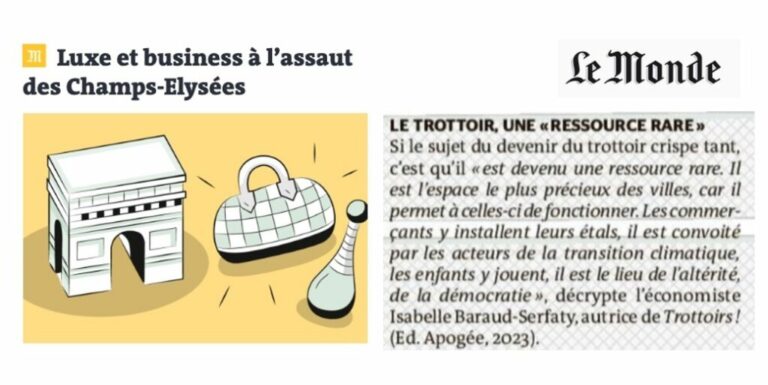 Les trottoirs des Champs-Elysées sont une ressource rare Merci à Emeline Cazi et Juliette Garnier pour cette référence à « Trottoirs ! Une approche économique, historique et flâneuse » dans leur article du Monde sur la manière dont « les acteurs privés ambitionnent de redessiner l’espace public parisien en finançant les aménagements ». A noter : il y a…